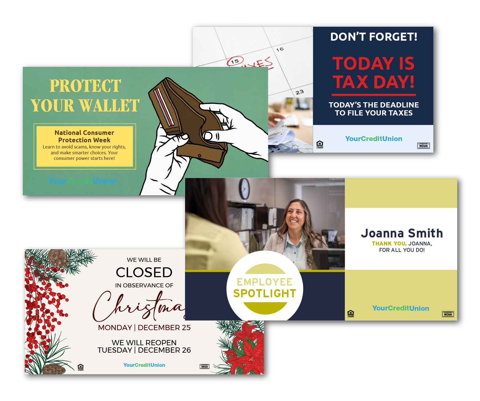 Professionally-designed layouts to engage members: Our Digital Signage provides credit unions with a wide selection of professionally crafted content for use on a credit union’s digital screens, including product highlights, holiday messages, fun trivia, live weather reports, and breaking news.